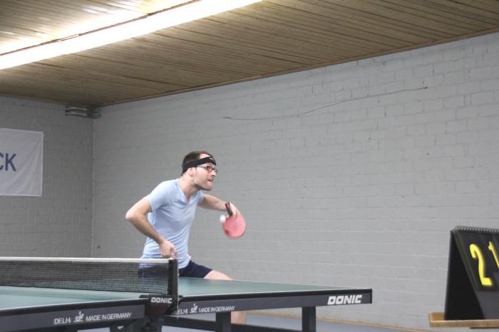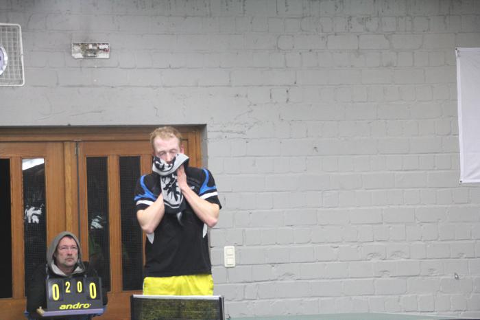 Nun stand das Spitzenspiel zwischen Müller und Eich an, in welchem dem Mark in der Vergangenheit schon häufiger den Kürzeren ziehen musste. Jedoch merkte man Mark nun den unbedingten Siegerwillen an und er konnte in einem Spiel mit teilweise hochklassigen Ballwechseln und unter großem Applaus den Sieg im Entscheidungssatz erlangen. Das skurrilste Spiel des Abends sollte nun folgen: Marcel wehrte insgesamt gefühlte 15 Matchbälle gegen Achim Veuskens ab um am Ende 15:13 im fünften Satz die Oberhand zu behalten. Nachdem er im ersten Einzel zahlreiche Matchbälle vergeben hatte, machte Marcel mit dieser besonderen Leistung alles wieder gut und es stand nur noch 5:6.